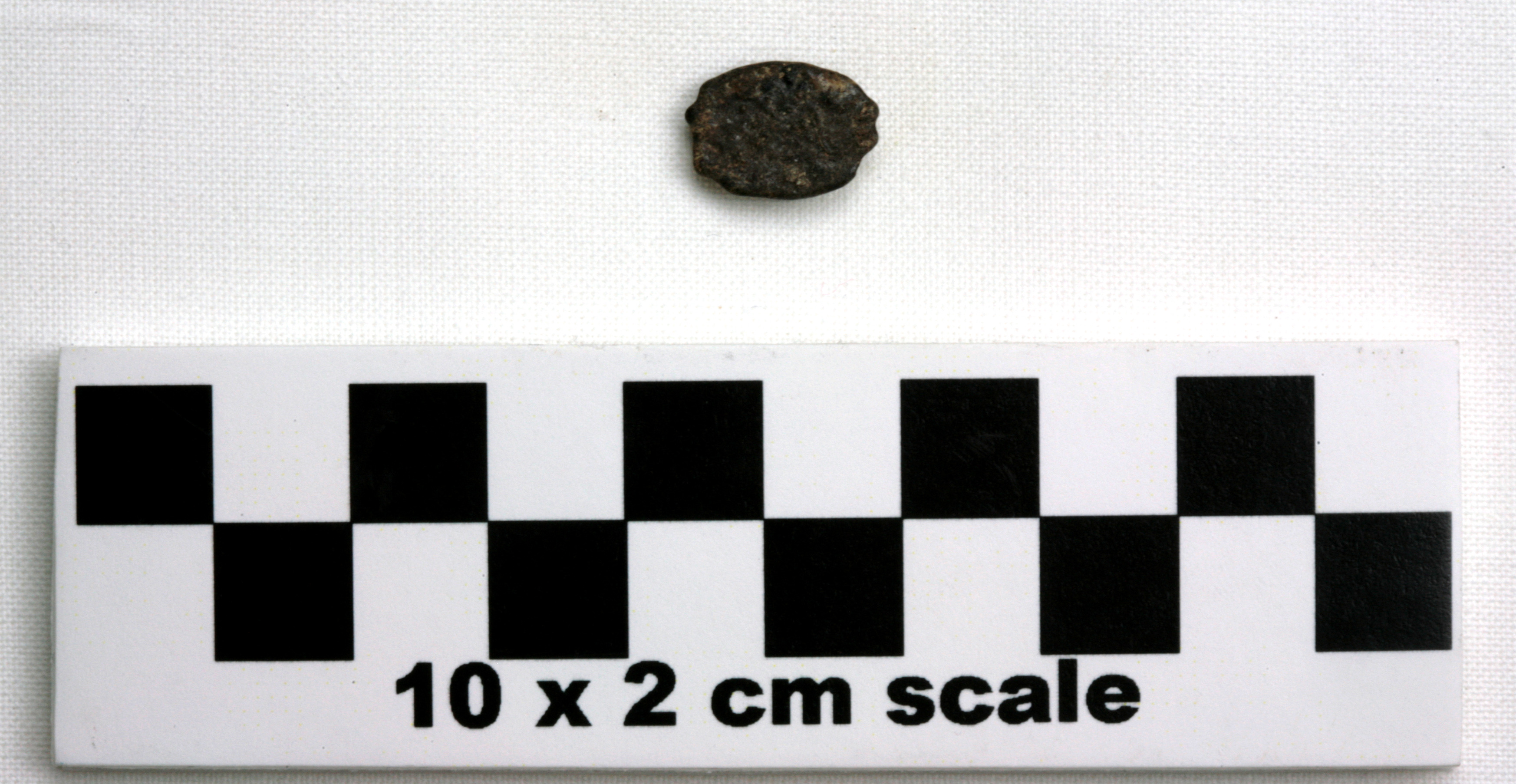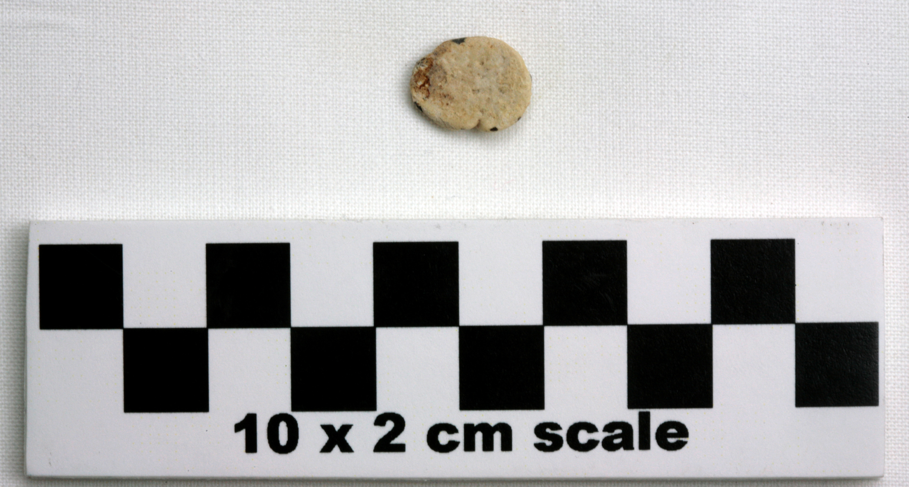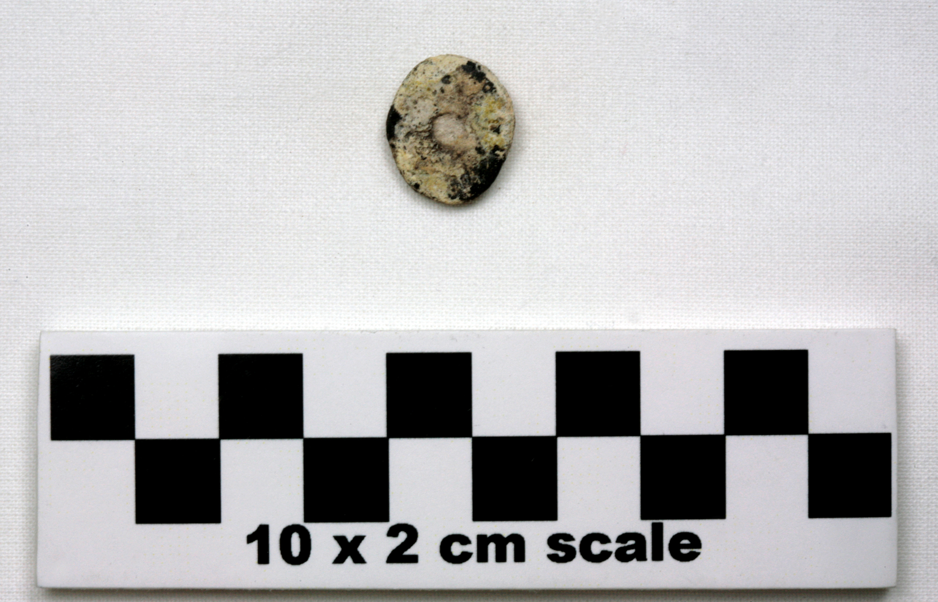 Roughly oval; 1 side flat, 1 convex; flat side some discoloration & brown blotches mostly around edges, hole bored roughly in center, approx diam 0.0028, filled w/ unknown substance; convex side some discoloration, See Comments